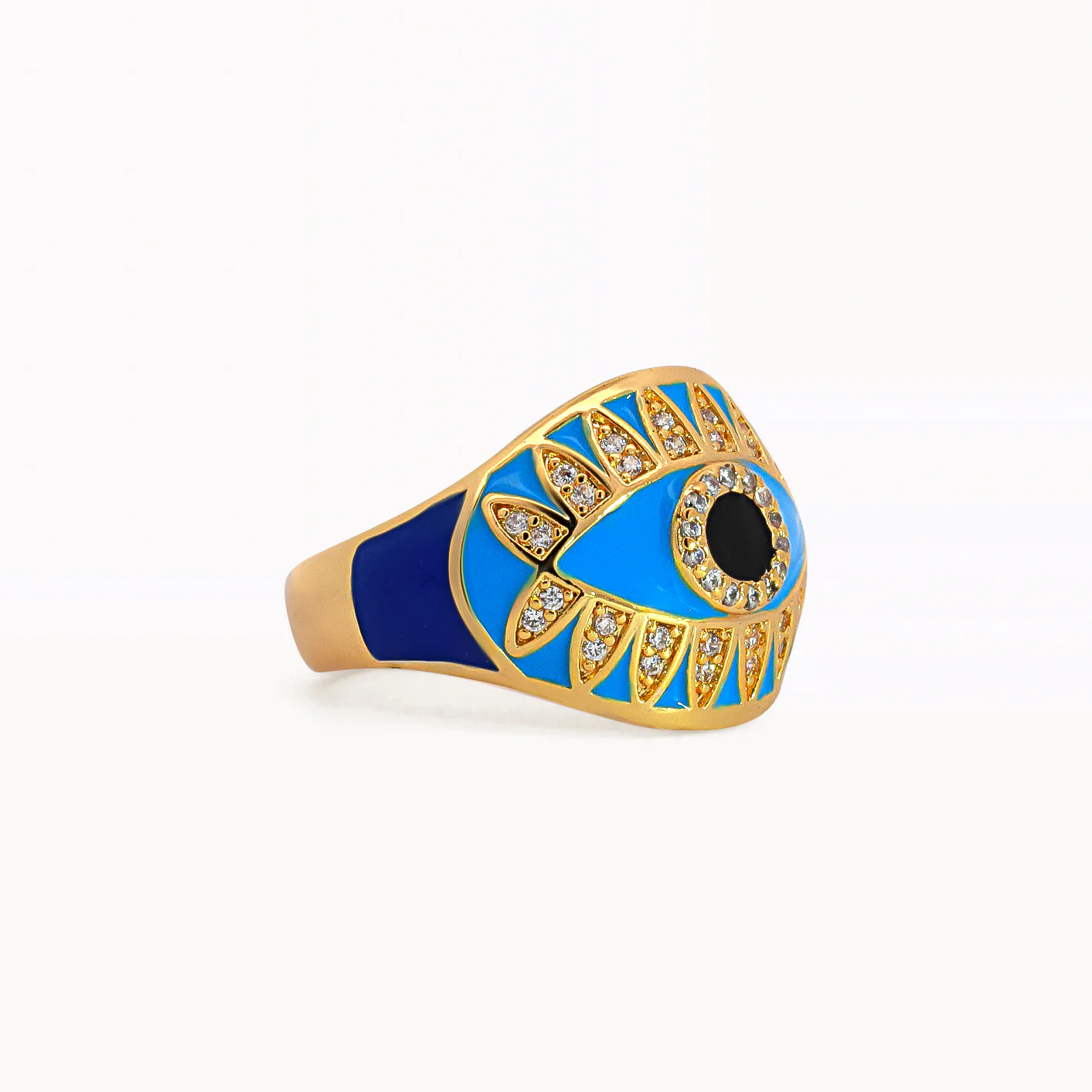 More is more at Xuxa, so this chunky ring is designed with a bit of everything (to match your larger-than-life personality). Beautiful blue enamel hues, a powerful evil eye design, and finished with sparkling clear cubic zirconia stones. Ward off evil spirits and shake up your everyday looks with an out-there ring that shows off who you are and expresses your individuality.